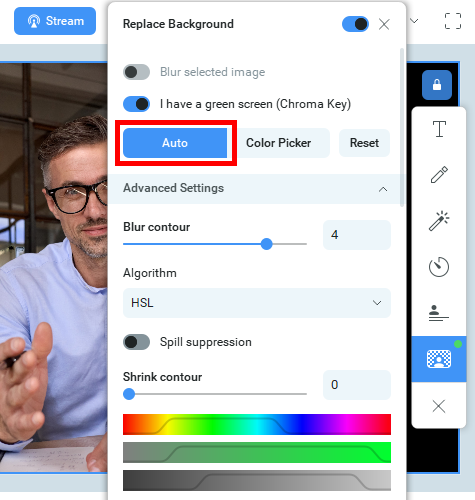 In the Auto mode, ManyCam automatically selects the colors to be replaced with the background, meaning you don’t have to do it manually. The result may vary, so it’s advised to adjust the Advanced Settings too in order to achieve the best outcome.
