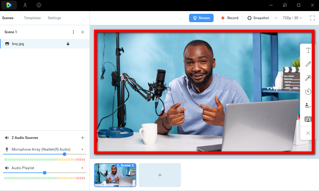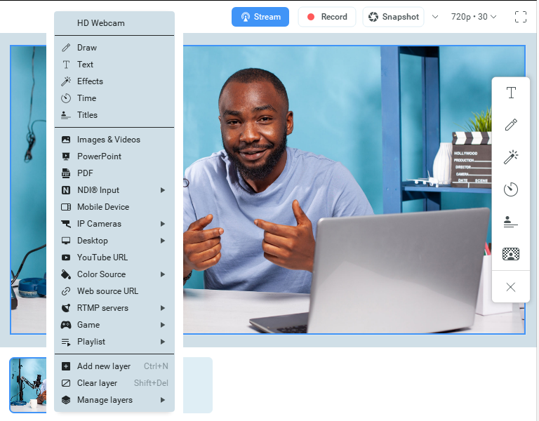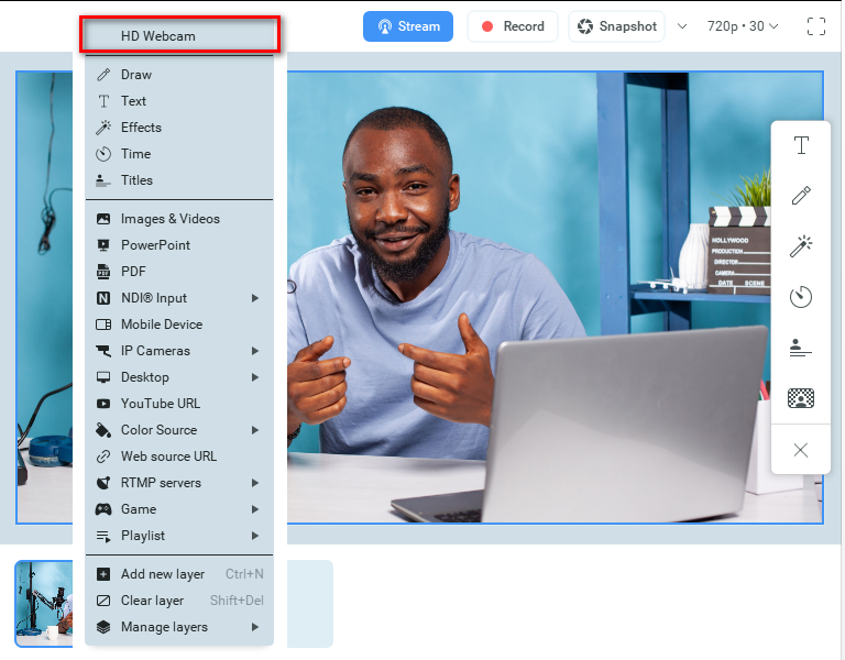 As shown below, ManyCam allows you to pick a video source for your stream, adjust it by applying effects and various multimedia settings, and start streaming/recording.