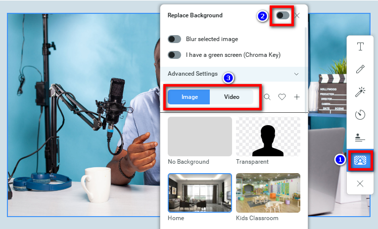 Click on the Virtual background icon, then select the Background replacement option and turn on the switch to enable the feature as shown below.