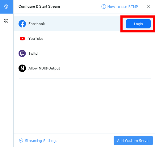 - Click Login to link ManyCam to your Facebook account. Make sure you are logged into your Facebook account in a browser.