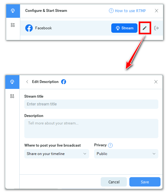 - Go back to ManyCam and configure your stream. Here you can pick a name for your stream, add a description, select destination, and adjust privacy settings. Once your stream is set, click on Stream button to go live.