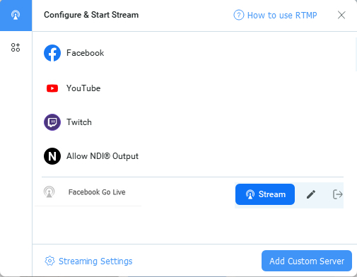 - Create an RTMP server in ManyCam using the stream URL and key from Facebook,