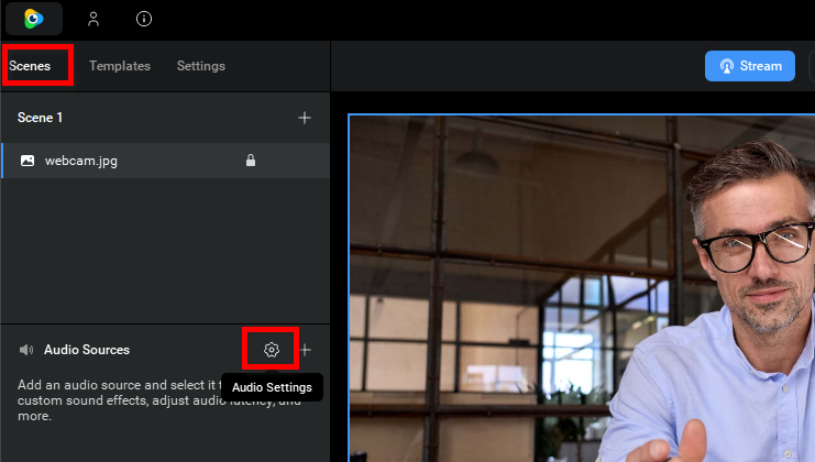 2. Or from ‘Scenes’ tab, click on the gear button next to ‘Audio Sources’.
