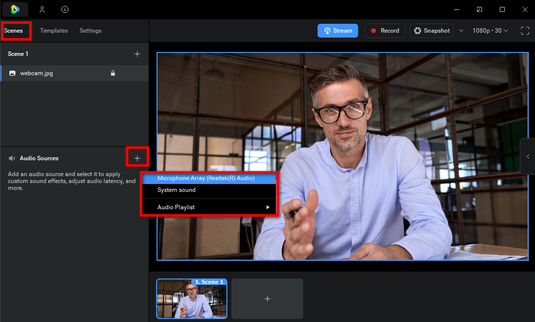 2. You should see your microphone under the Audio Sources section. If it is not the case, click on the ‘+’ sign next to Audio Sources and select Microphone.