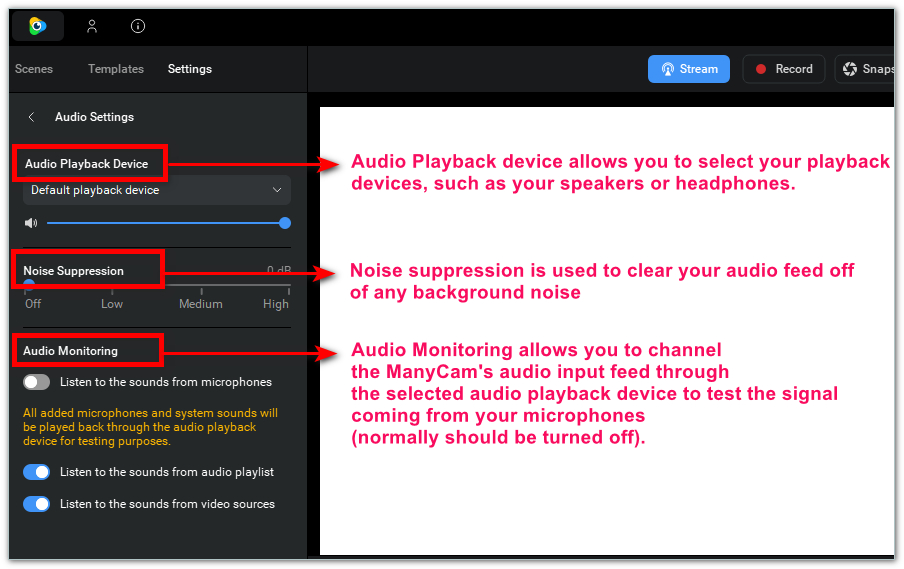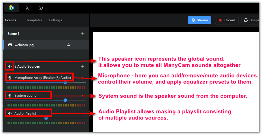 ManyCam Audio contains several components that allow you to configure your stream’s audio settings.