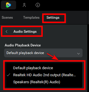 In order to change the Playback Device in ManyCam, click on the currently selected device under Audio Playback Device and select a new device from the drop-down list.
