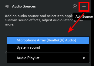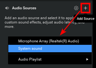 Audio sources allows you to add more devices and configure microphone, audio playlist and system sound settings.