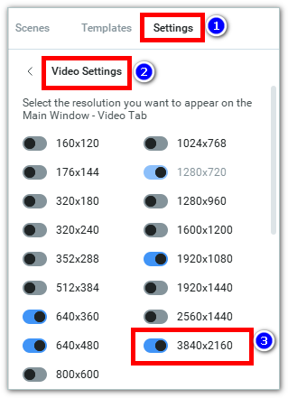2. Navigate to ManyCam menu ⇒ Settings ⇒ Video and enable the 3840×2160 option (4K). This resolution will now be available in ManyCam.