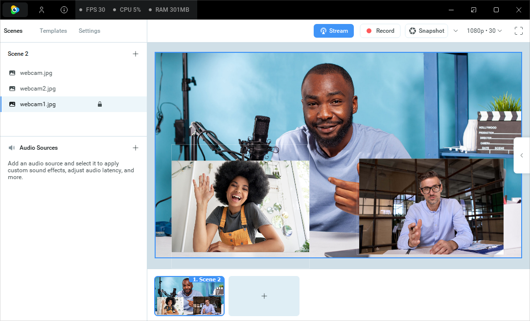 Picture-in-Picture is a ManyCam feature that allows you to add multiple video windows (layers) to your video feed. The PiP layers are fully customizable meaning you can resize them, move around the screen, bring them to back or front, clear, mute, remove and add as many layers as you want with different sources in them.