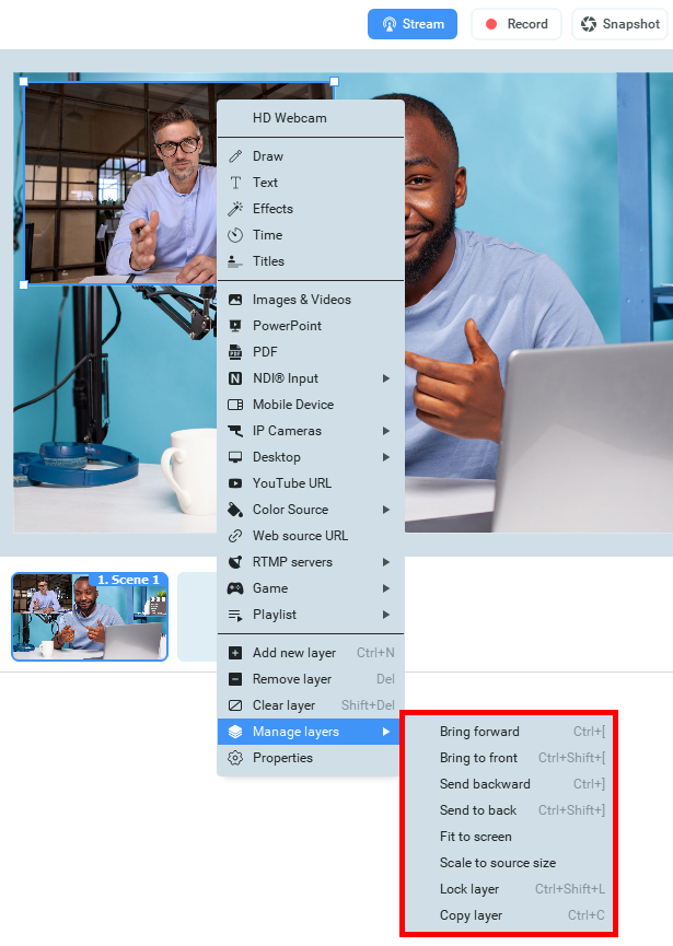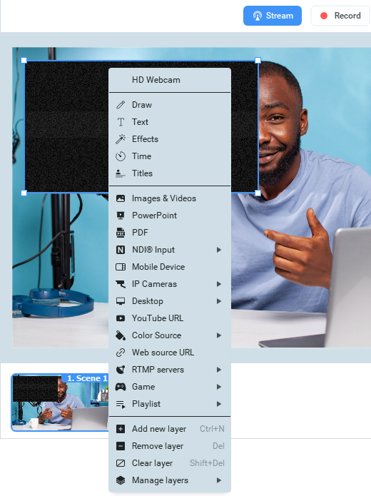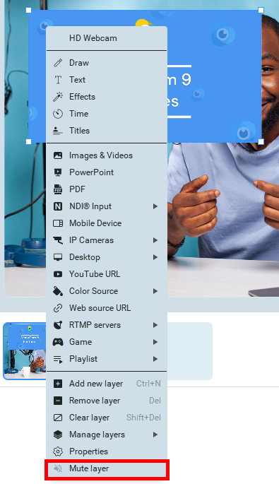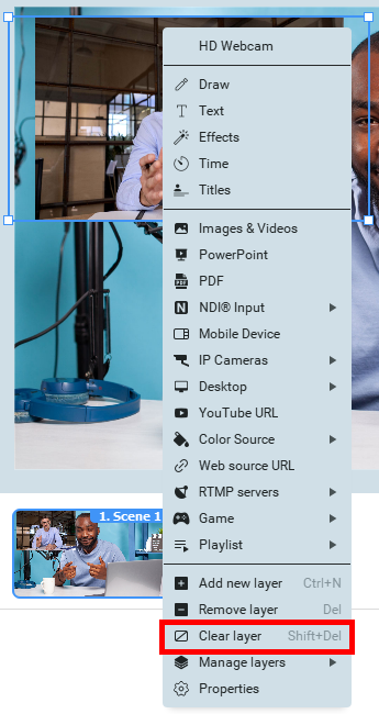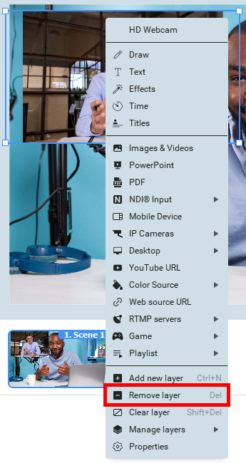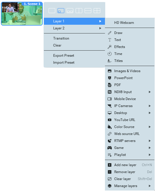 Another way to customize your PiP layers is by clicking on a preset number. By doing so, you will access a list of all layers a PiP preset contains. Hover over any layer you see on the list to open a context menu with all ManyCam video sources.