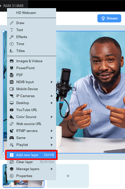 There are plenty of video source options available in ManyCam, you can check out the full list here. There are a few ways to set a video source for a selected PiP layer. You can tell if the PiP layer is selected by a blue border along its edges. To select a layer, simply click on it.