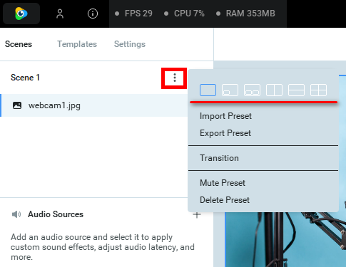 Alternatively, you can use Picture-in-Picture mode presets from the Scenes panel on the left. To do so, click on the three dots and select the PiP preset as shown below.