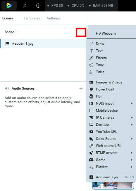 To add a layer, click on the + icon next to Scene as shown below. Then assign a video source to the layer by selecting one of the sources from the drop-down list that appears.