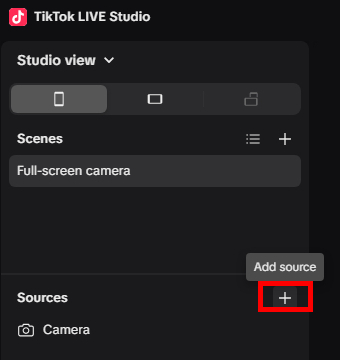 Launch TikTok LIVE Studio. In the Sources section, click on Add source + sign icon.