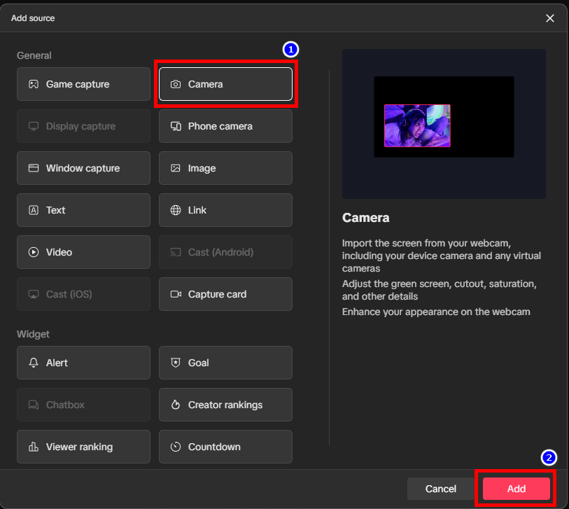 In the Add source window, select Camera. Select Add button.