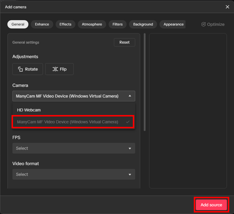 Select ManyCam Virtual Camera. Make adjustments if needed (rotate or flip). Click on Add source button.