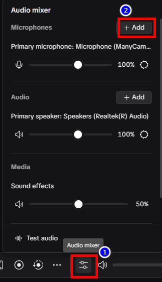 From the bottom part of TikTok LIVE Studio, click on Audio Mixer icon. And click on Add button next to Microphones.