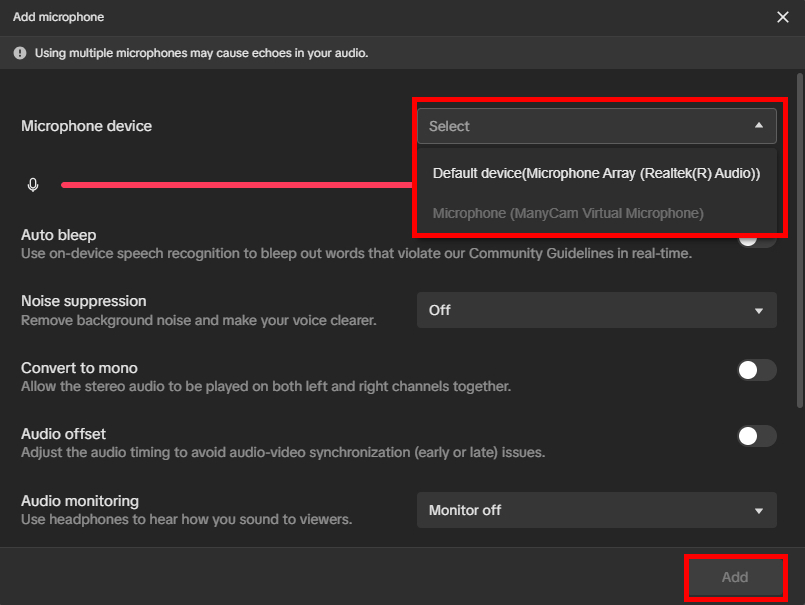 Select ManyCam Virtual Microphone as the Microphone Device. Click on Add button to finalize the choice.