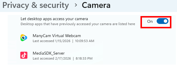 Make sure Let desktop apps access your camera is activated.